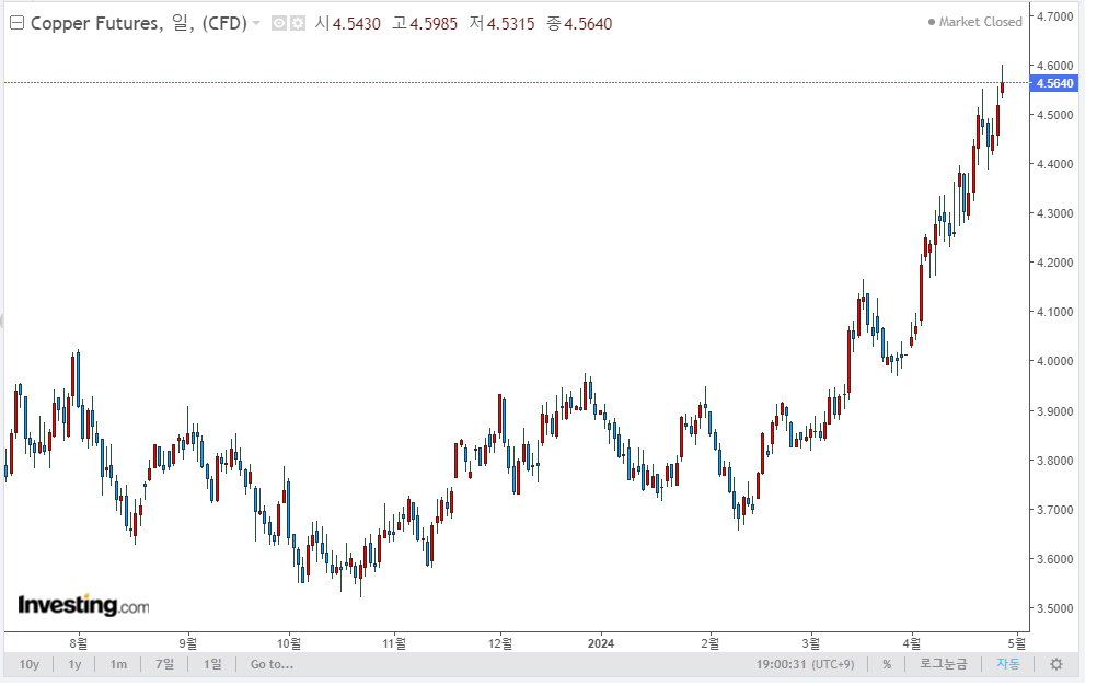 그리고, 구리값이 또 상승했다. 1.3%. 엄청난 상승이다. 이 가격이 오르는 한 국내 전선 주들은 좋을 것 같다.