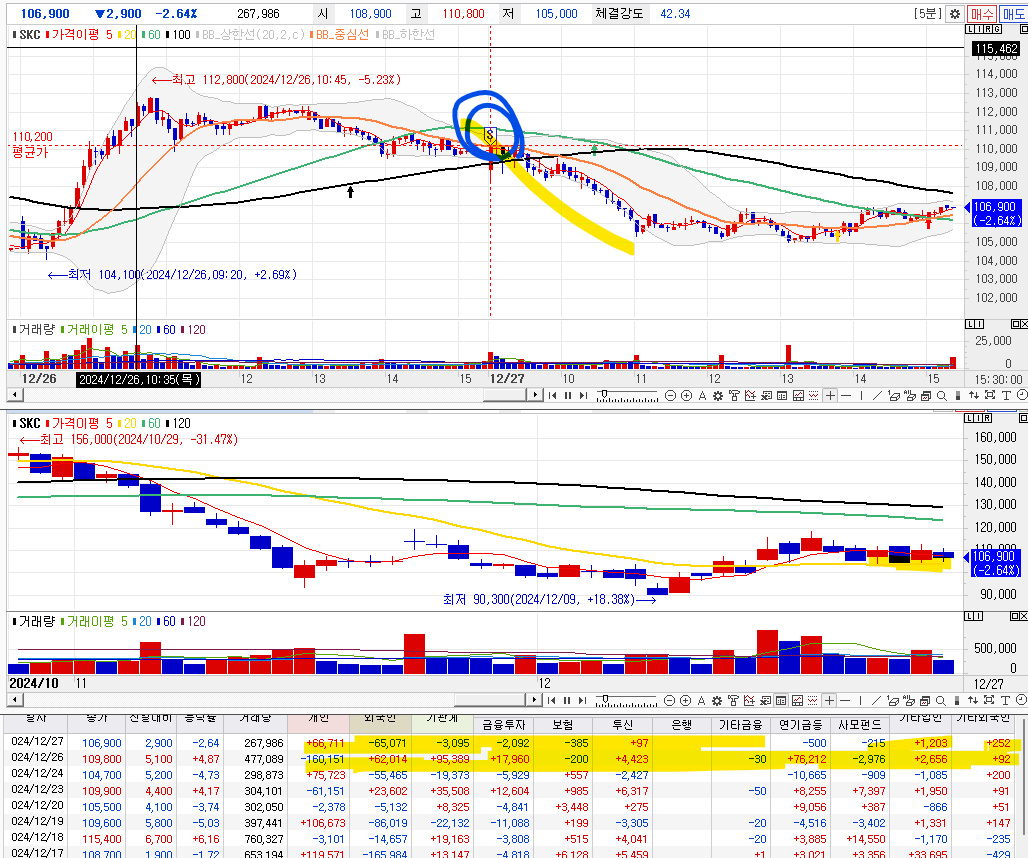 매수근거 : 어제 눌림이후에 오늘 장대양봉 이후에 15분봉 20분선을 타고 올라감. + 투신, 사모, 외국인 역대금 금액 매수들어옴. (9% 상승)