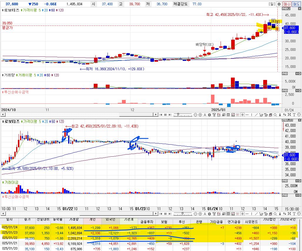 1. 매수이유 : 로봇주들중에서 최근 강한 모습과 장대양봉이 나오고 다음날 종가에서 매수 ==> 투신, 사모펀드의 매수를 보고 매수 진행