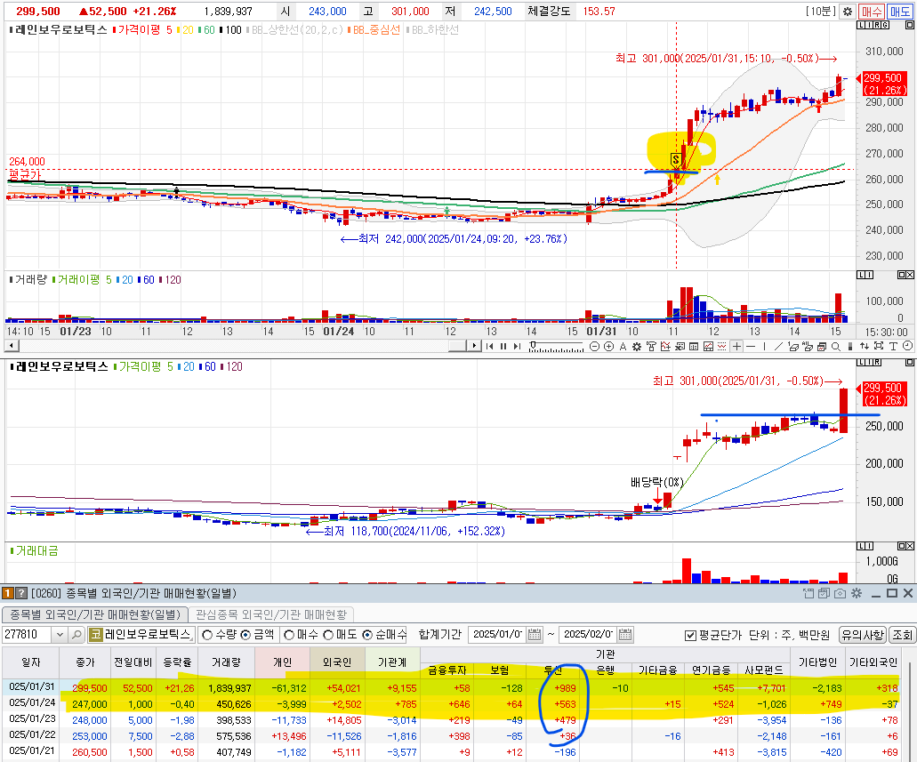 1. 매수이유 : 로봇주의 강세 - 25년주 대장 테마로 결정함. 하락시마다 매수 (단! 기관 - 투신의 대량매도가 있기 전까지)