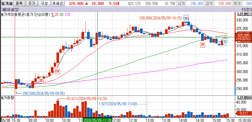 난 그 전에 차트의 모양새가 상승하는 모양이 좋아서 어제 매수를 했었는데, 매도를 하고, 오늘은 그 상승의 정점을 찍은 것 같다.