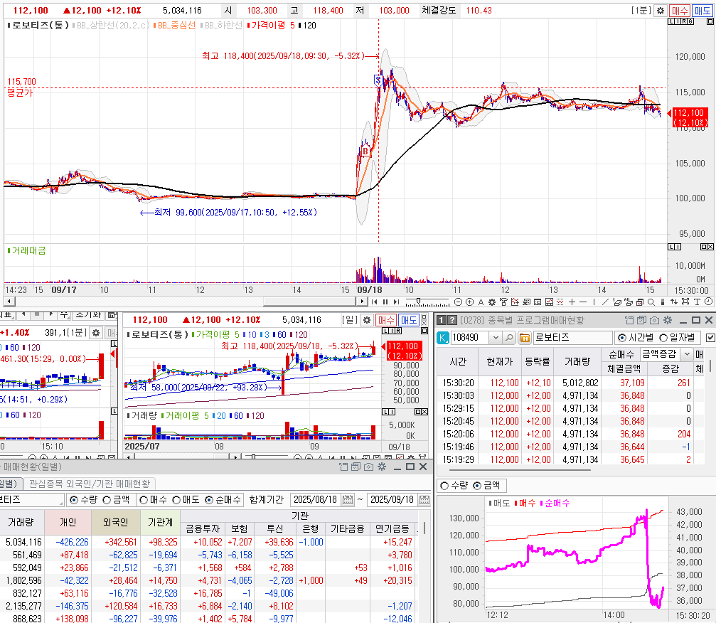 장 시작후에 거의 모든 로봇주가 상승하기에, 최근 급등후에 보합권에 놀던 로보티즈에 프로그램이 들어오는 것을 보고 매수했다. 초반에 잠깐 밀리는 듯 하다가 잠깐 딴청 필 동안 급 상승을 하였다. 와.. 진짜..