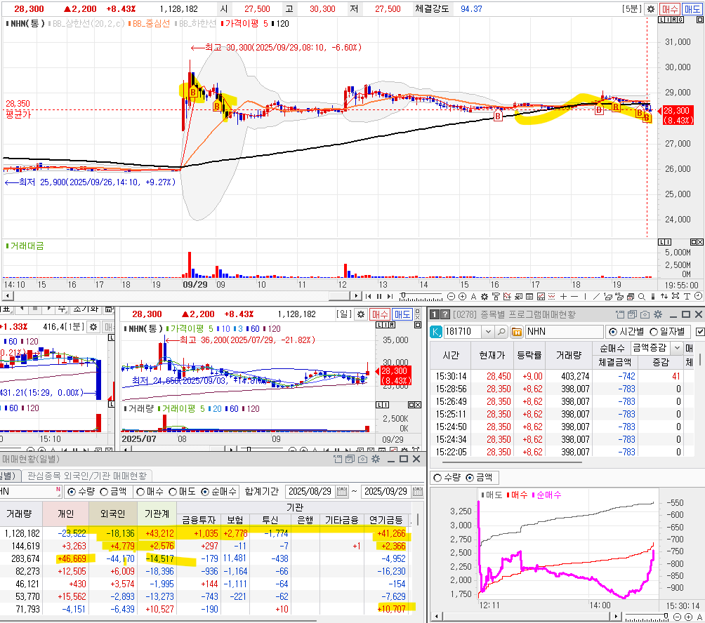 예상은 맞았다. 이 종목이 과열종목지정 예고가 되니, 다른 종목이 큰 상승했다. NAVER, NHN 이 크게 상승했다.