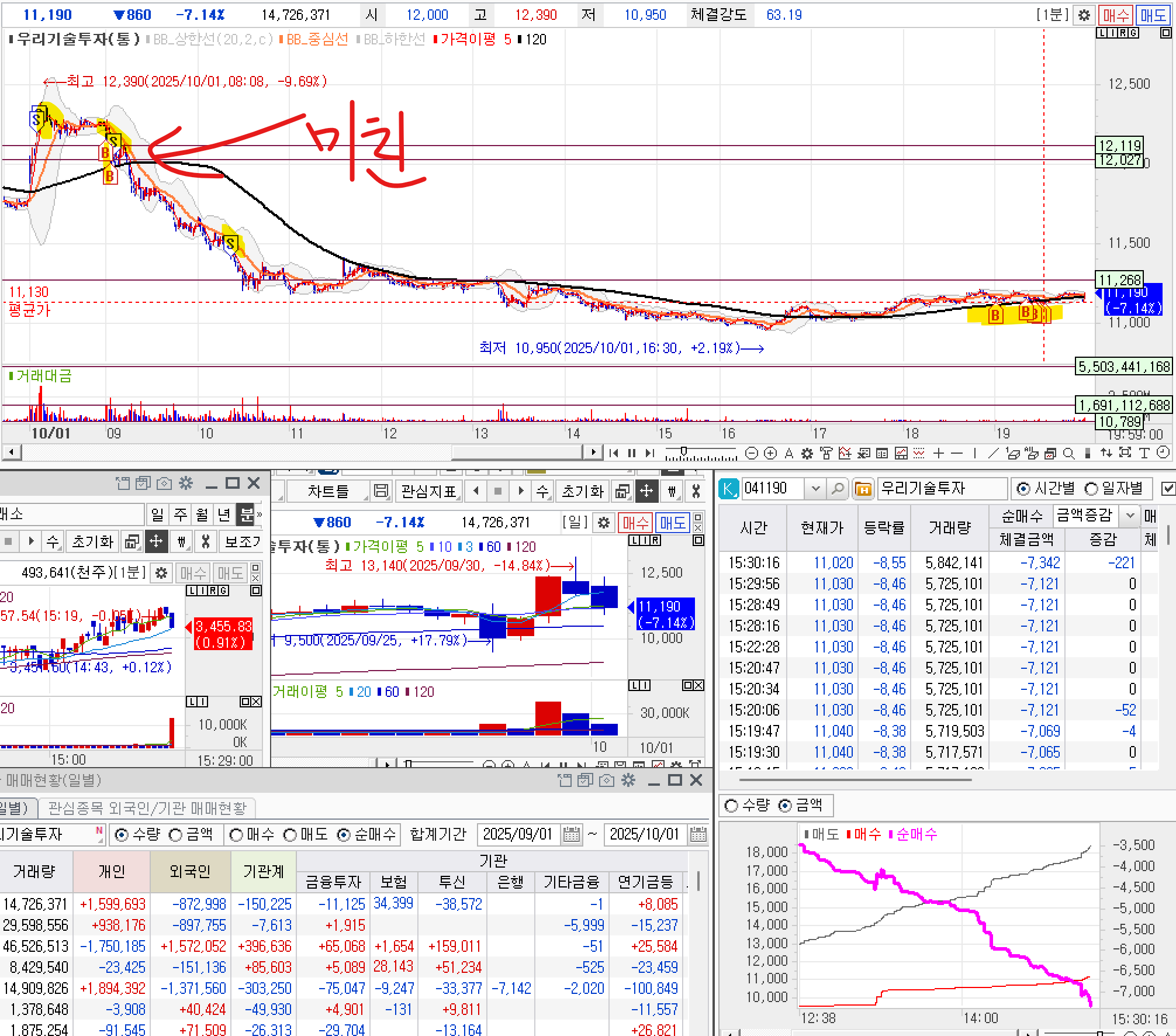 이 종목은 어제 가지고 온 종목인데, 아침에 익절 기회를 줬는데, 익절 후 재매수후 급락이 나오면서 하루종일 흘러 내렸다.