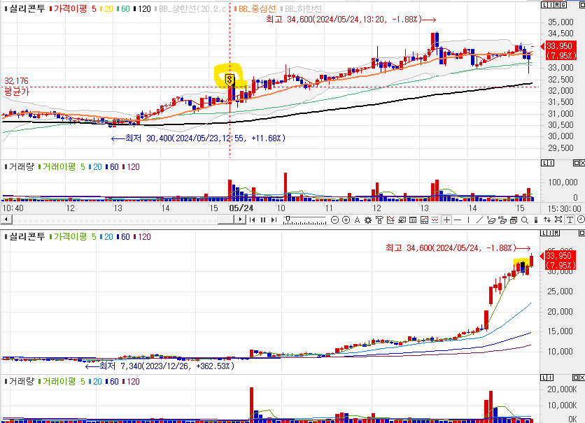 매도 : 5% 상승한 시간외에서 전날 매수하였지만, 3%로 시간외 마감하여 아침에 불안한 마음으로 시작, 초반에 밀리다가 10분 전에 슈팅 발생으로 매도 처리하고 나옴.