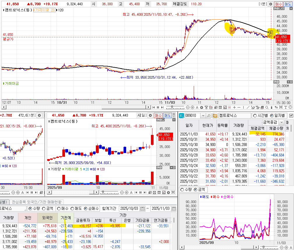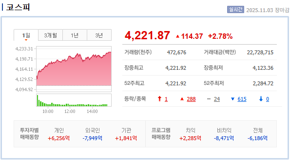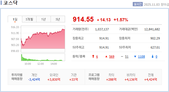 와.. 이게 정말 짜증나는 것이다. 아침에 무너지는듯.. 안 무너지는 듯.. 왔다가 갔다리하여, 일단 지난주 금요일에 너무 많이 상승해서 아침에 매도를 했는데, 주말 내내 APEC 의 앤비디아 젠슨황의 연설에 따라 로봇이 강세라는 것을 알고 있엇지만, 참지를 못하고 매도를 했는데, 완전 발매도했다. 이후 10% 이상 .. 젠장.