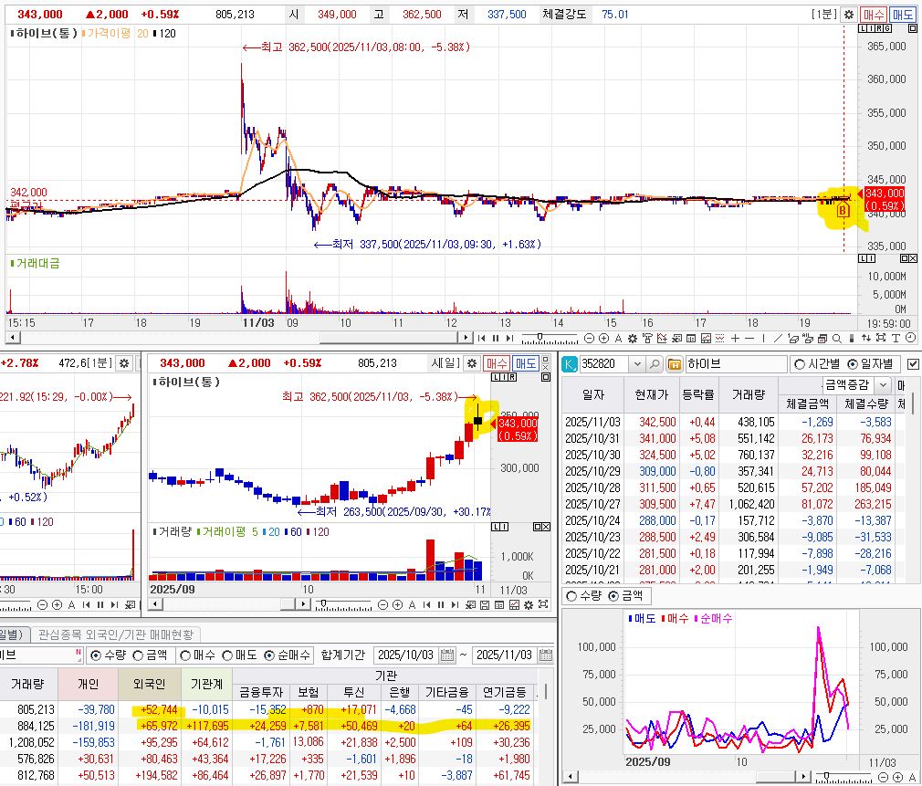 하이브는 작게 상승하면 조금씩 상승하고, 갭이 뜨면 그냥 매도하는 것을 원칙으로 진행한다.