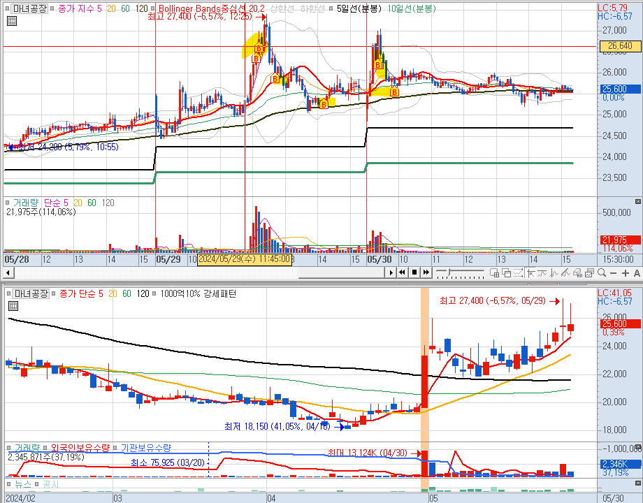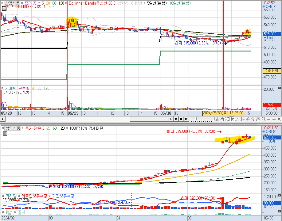 매매근거 : K-푸드의 성장과 불닭볶음면의 강세, 그리고, 시가총액 역전(농심) 무엇보다도, 일봉상의 모양이 너무도 내가 좋아하는 구성이다. 점점 상승으로 올라가는 모양새. 만약, 물량이 들어오는 것이 느껴지면 매수를 강하게 진행해 봐야겠다.