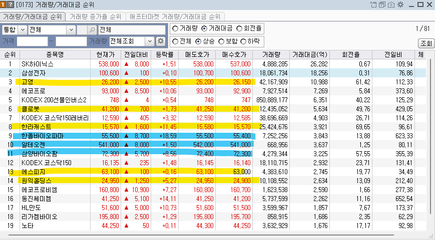 한국시장은 우선, 오전장에는 로봇주가 모두 오르고, 2차전지 관련주가 큰 상승을 보였다.