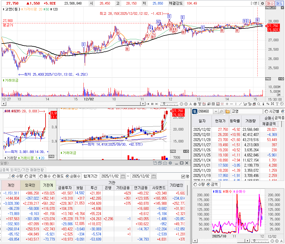 수급이 미쳤다. 고영보다도 더 수급이 너무 좋다. 이러다가 한번 물량이 빠지면 겁잡을 수 없이 하락하기도 하는게 주식이다.