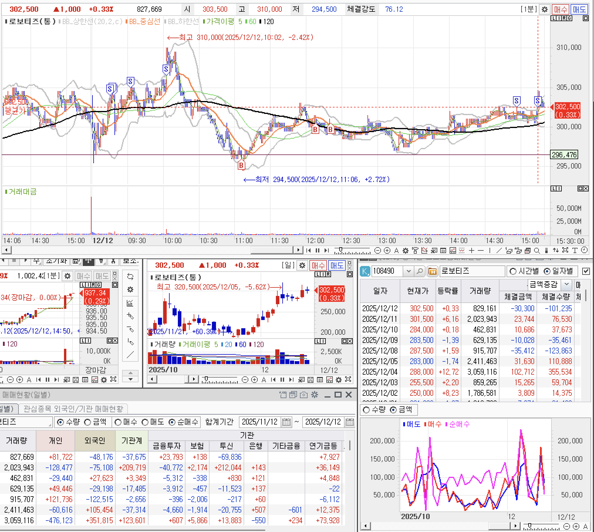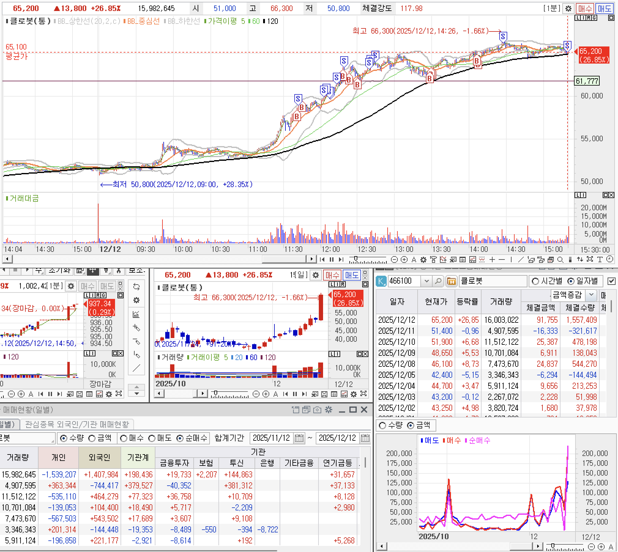 어제부터 가져온 로봇주이지만, 최근은 힘이 느껴지지 않는다. 어제 약간의 수익이 발생했지만, 오늘은 모습이 그렇게 좋지 않았다. 계속 밀리는 모습을 보여줬고, 수급이 안좋았다. 로봇 관련 모든 수급은 클로봇에 몰렸다.