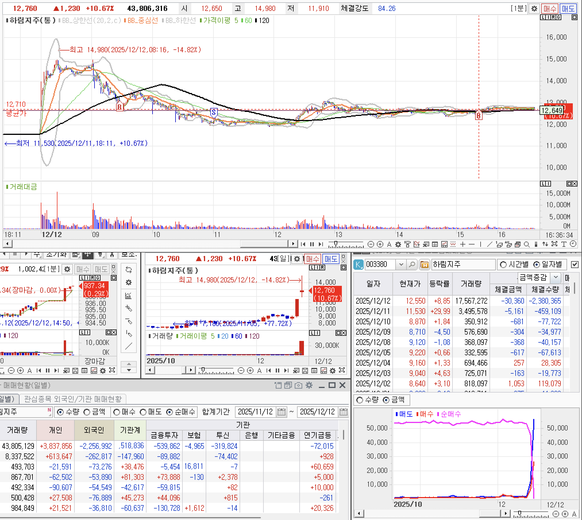 하림지주는 100% 자회사인 하림산업을 통해 서초구 양재동 화물터미널 부지에 물류·주거·업무 시설을 결합한 복합단지 개발을 추진 중이기에 최근 고속터미널 복합건물 건립과 맞물리면서 상승하였다. 하지만, 매수후 참지 못하고 매도를 했고, 시간외에서 추가 매수하였찌만, 하락중이다.
