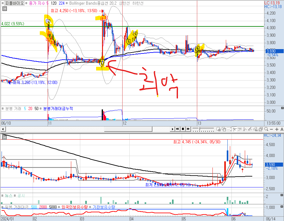 매매근거 : 전날 치매 관련 뉴스(확인하지 않음)가 나와서 일라이릴리가 상승했다는 소식만 듣고, 관련주식을 찾다가 피플바이오를 확인하고, 장초반 매수 진행했다. 처음에는 수익으로 나왔는데, 참질 못하고 추가 매수하다가 물렸는데,