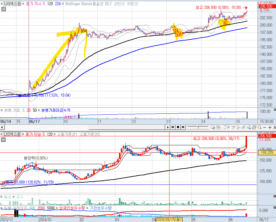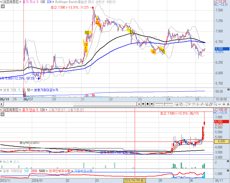 오후 1시쯤 특징주 검색해서, 특징주 중에 양.매수가 들어오고 있으며, 뉴스가 정부, 대통령, 삼성 등 대기업과 연결되어 있는지 확인, 차트가 일정 가격에 지지를 걸쳐 보임.