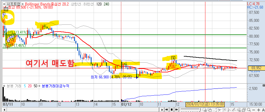 그래서 수익원이 왔는데, 매도를 제대로 하지 못했다. 그냥 걸어두고 약 손절로 매도를 했다.