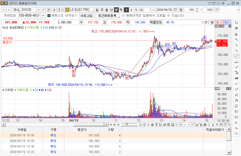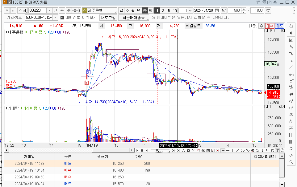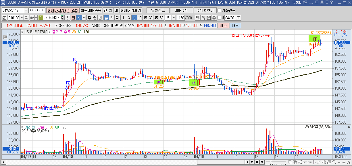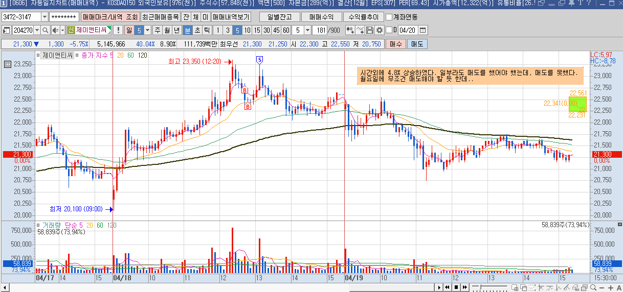 이후에 120일선을 껬지만, 지수도 깨지면서 내려가기에 그냥 지켜보다가 강한 상승시에 점심시간이라서 매도를 못했다가 전 고점에 다가오길래 매도를 진행하였다.