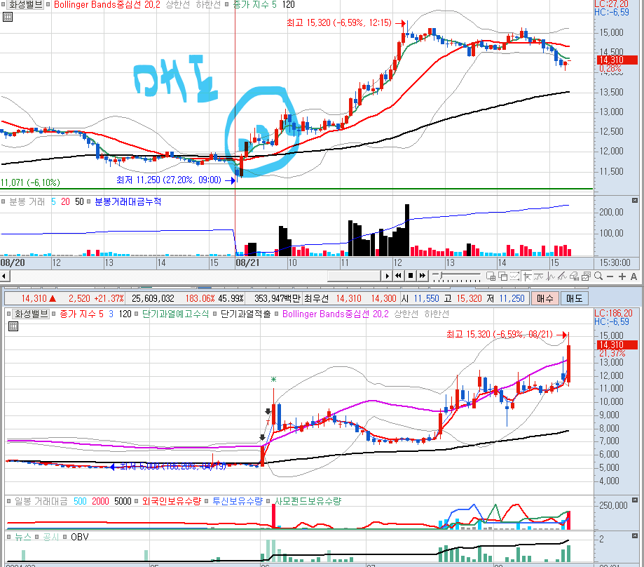 수익권에 매도를 했긴 했는데, 어제의 원칙 21% 상승에 팔았어야 했는데, 초반 하락 출발 후 지속적으로 상승하여 수익권에서 매도했다. 그 이후에, 쭉~~~~ 올라가서 상한가까지 갔다가 내려왔다. 그것도 정확히 21%에서...