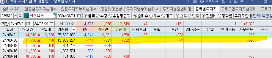 --> 1시간 후 공부하다가,,, '아니다. 수급을 보니, 투신과 사모펀드가 매수가 본격적으로 들어오는 것 같다.