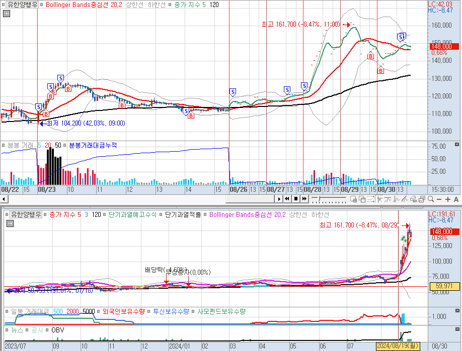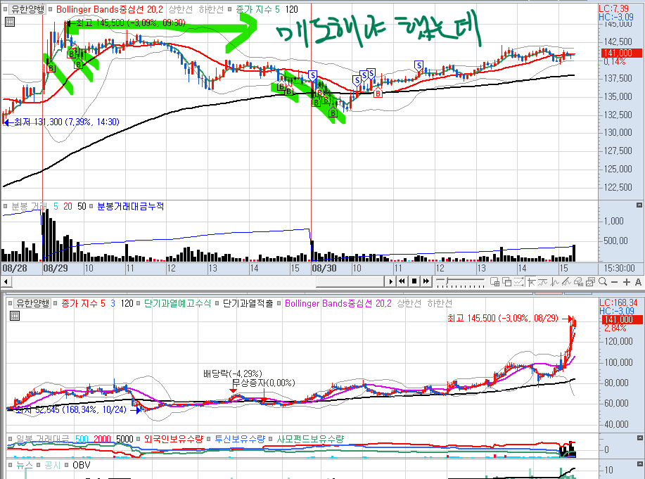 30일 실행 : 아침에 푹 꺼지더라, 아마도 유한양행 투자주의 받고 나서, 물량이 나오는 것 같았다.