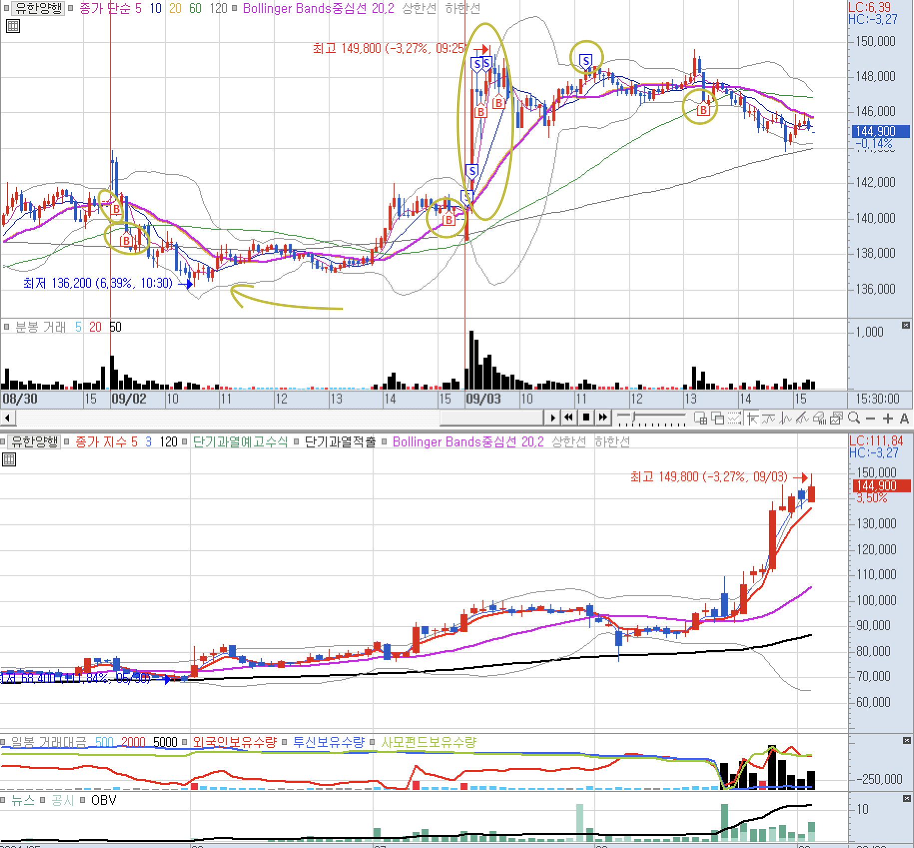 오후장에는 하락이 나오면서 지금은 보합권이다.