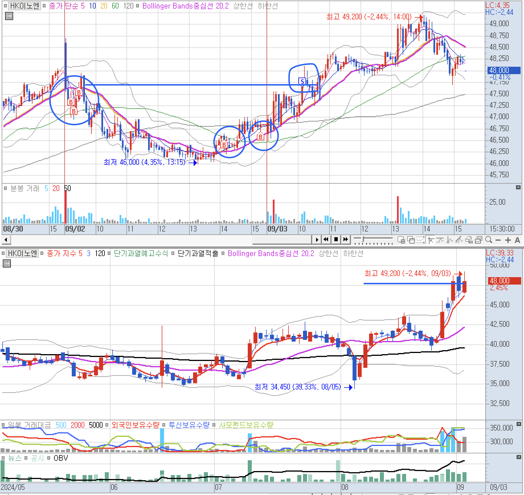 최근 250일 최고가에 가깝게 나오고 이쏙, 거래량도 계속 상승하기에 어제 장초반 밀릴 때 매수를 했는데, 이럴 때 매수를 하는게 아니라, 5분봉 2개가 하락하면, 그냥 지켜보고, 0시 이후에 차트모양을 확인했어야 하는데, 그냥 매수를 하고 말았다. 이후에 오후 13시 30분 부터 상승으로 반전하기에 죄금씩 매수를 했다.