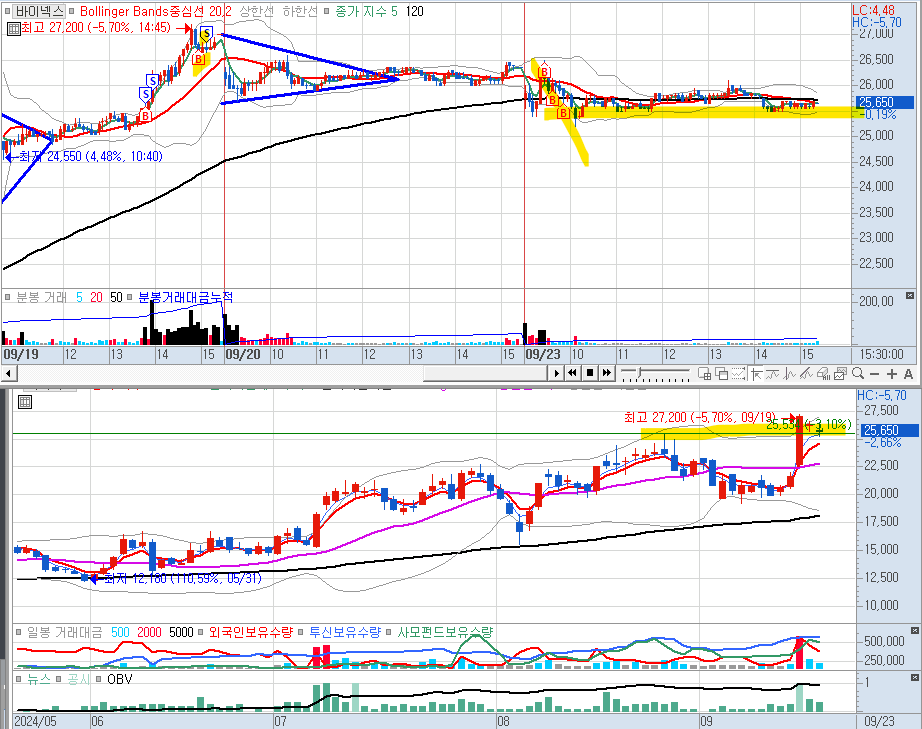 양매수 들어오고, 1일 정도 조정을 받았다. 시간외에서 25,050원(-4.93%)까지 하락했다.