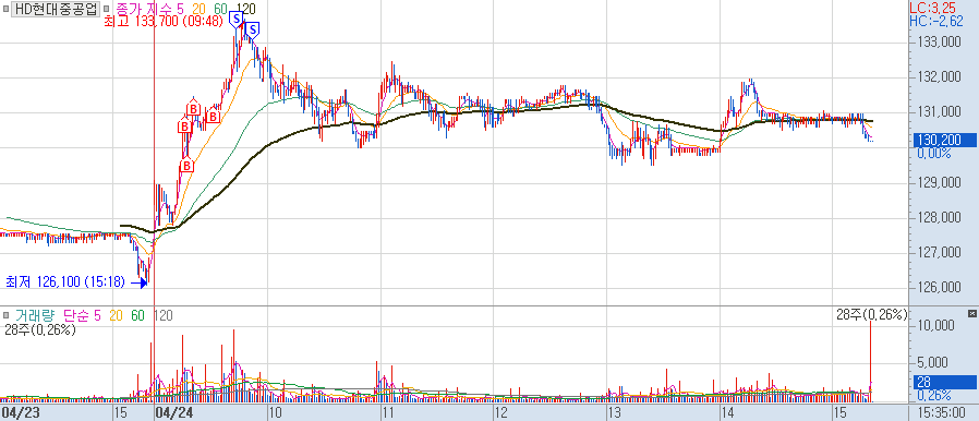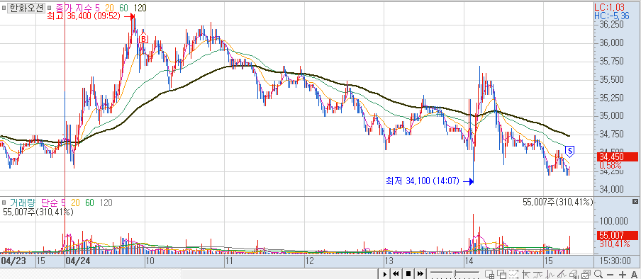 제장할.. 현대가 올라가고 한화오션이 뒤따라 올라가기에 오전에 현대중공업으로 일부 수익 발생 후 , 1등주가 다시 한화로 바뀌는 듯하여 매수하였는데, 오히려, 상승고점에서 내려오기 시작했다.
