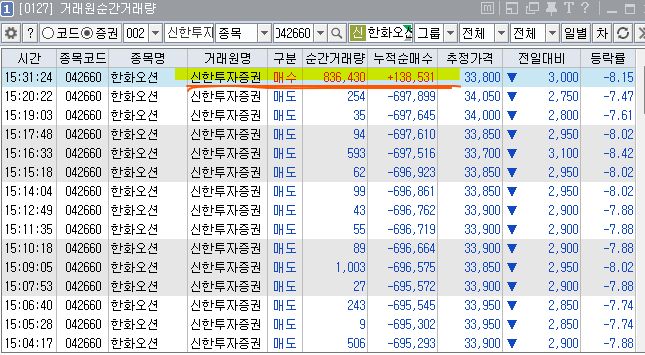 한화오션에서 외국인 창구. 신한투자증권의 양아치 같은 걸 확인해 보자.