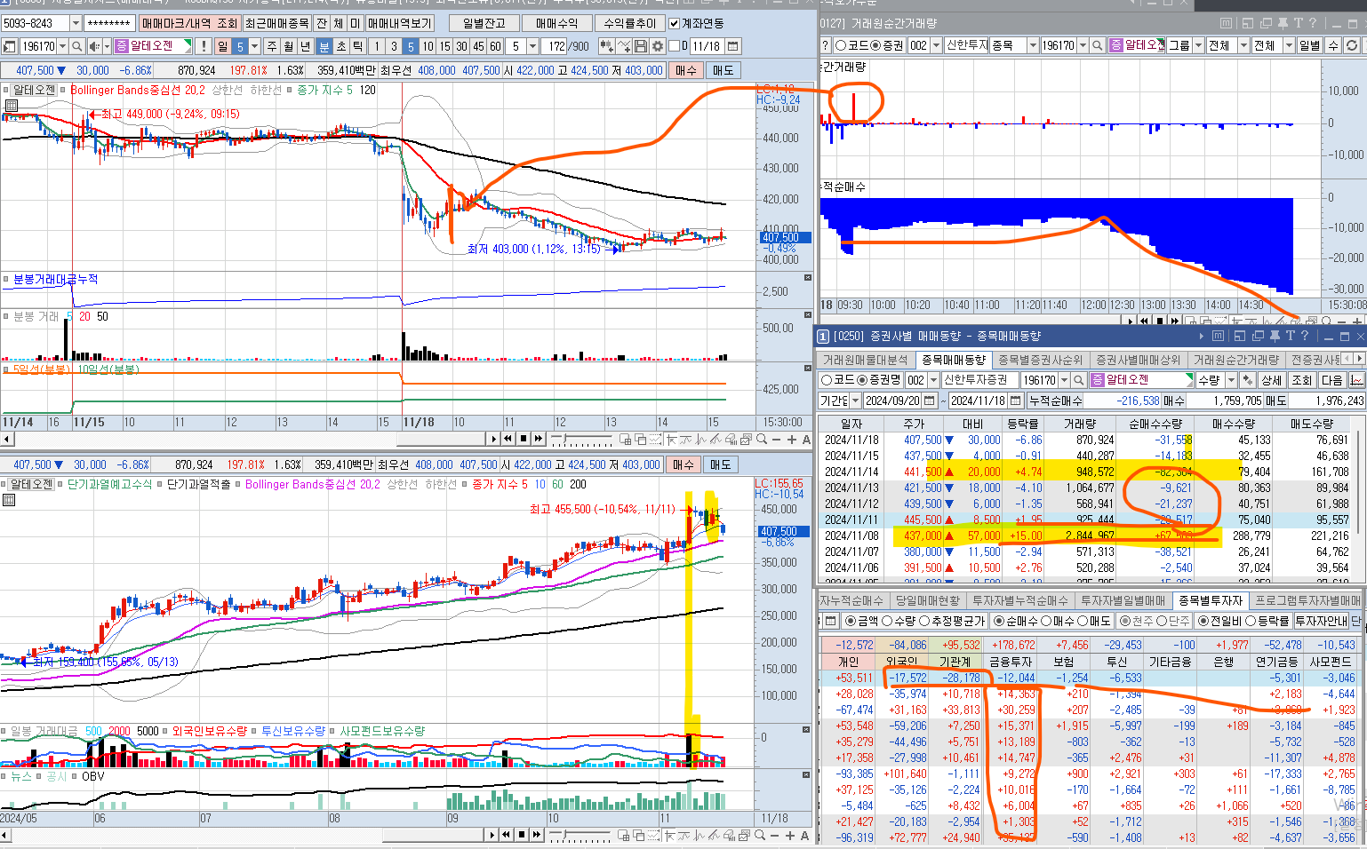 14일 오전에는 신한은행의 수급이 - 였다가, 오후에 + 되었는데, 그 흐름이 아주 조금씩 매집하는 스타일이 였고,