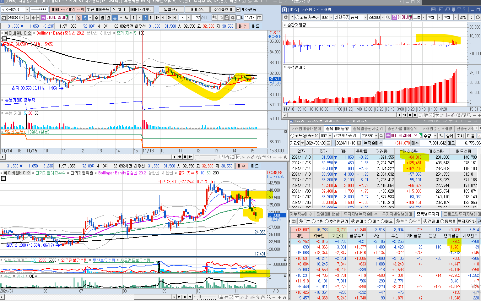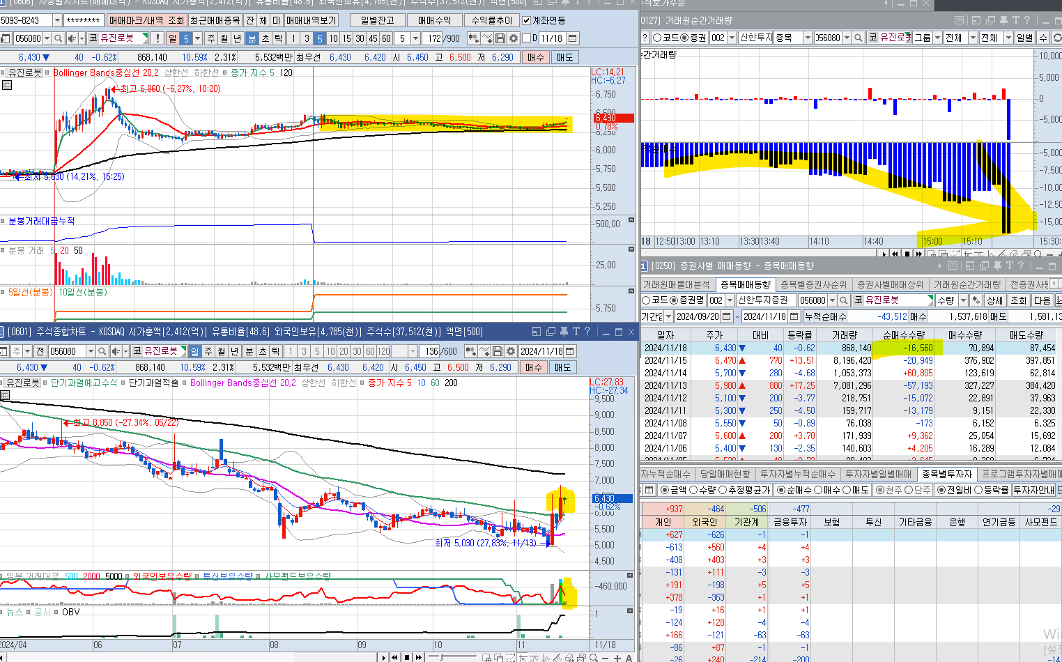 금일 매수를 하지 못했다. 유비에스에서 대량 매수를 진행했다. 종가 부분에 더 매수를 했고, 신한투자도 장중에 조금씩 매수를 진행했다. 거래량이 너무 적다.