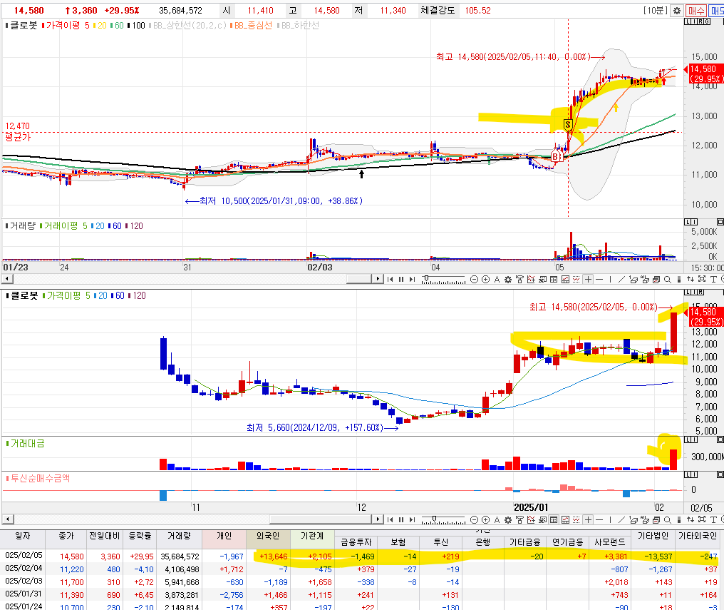 1. 금일, 클로봇의 상한가로 이어지면서 8% 상으로 이어졌다.