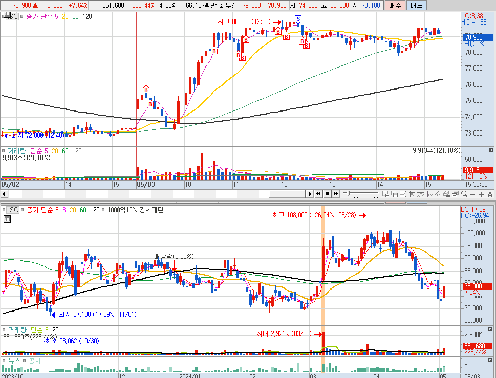 --> 오전장에 소켓관련주 서치 --> ISC, 티에프이, 리노공업 확인 --> ISC가 차트상 반전 가능 상태, 리노공업은 너무 높음.